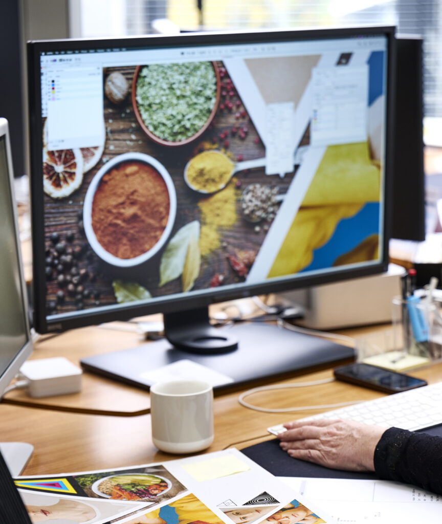 Vi justerer layout, billedvalg og opbygning efter materialets struktur og den måde, det gengiver farver og kontrast på – med fokus på et klart og genkendeligt udtryk, når emballagen møder kunden.