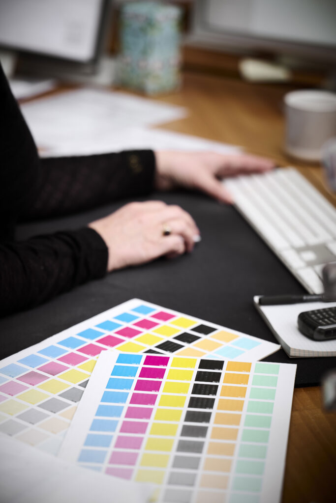 Farverne bliver tilpasset både materiale, trykmetode og kundens farveprofiler.